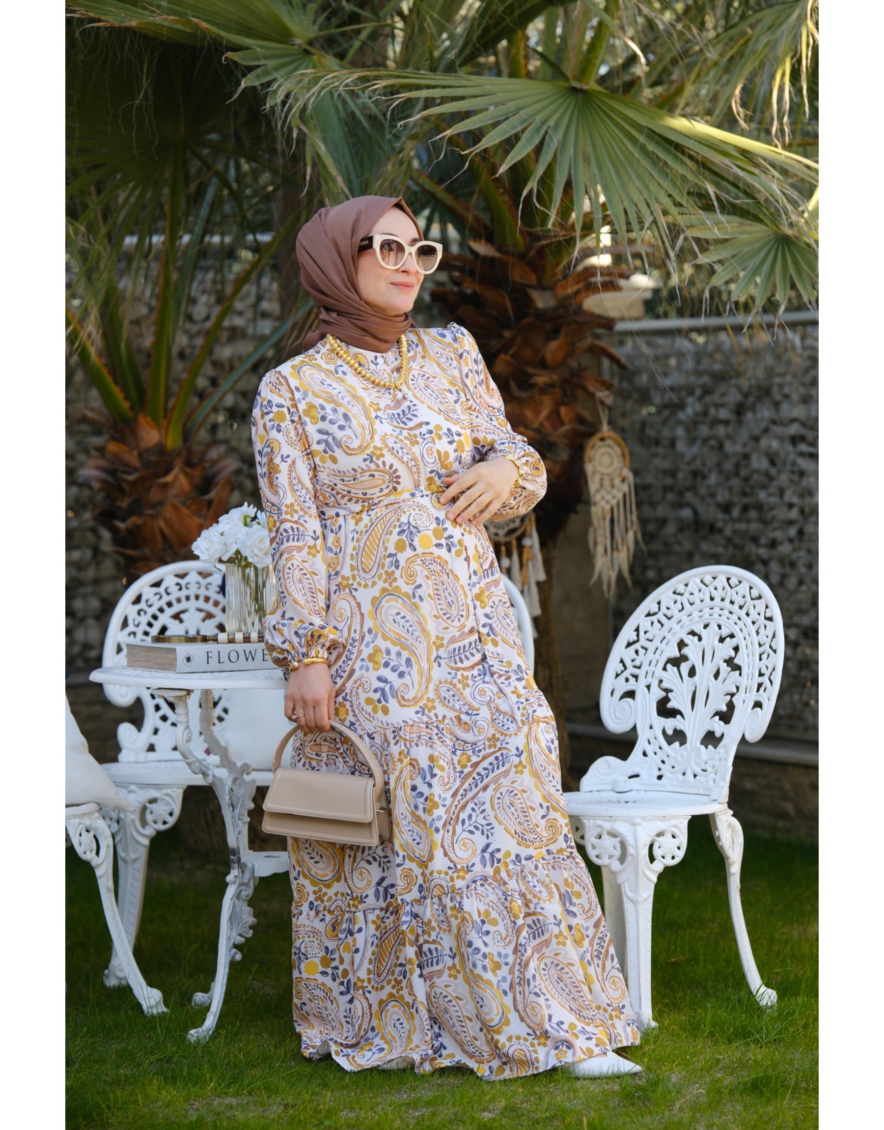 Bayan ŞAL DESEN HARDAL ELBİSE | Merve Karaca