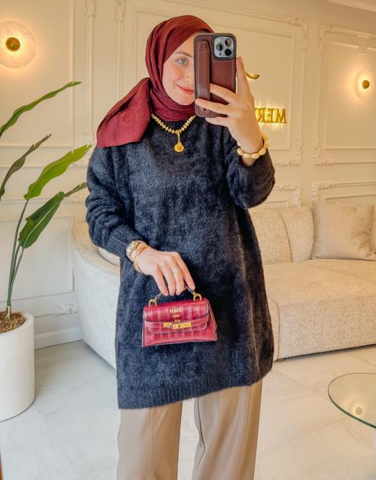 Koyu Vizon Etek Üstü Simli Örgü Triko Kazak