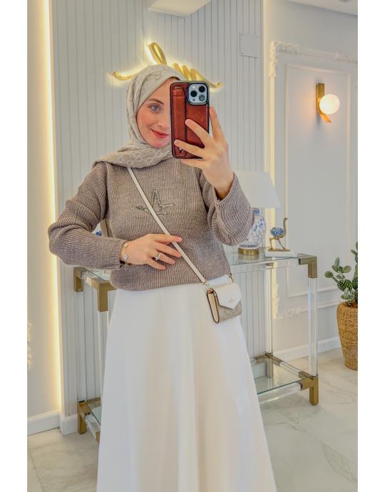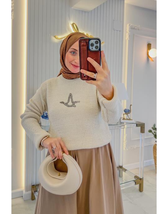 Krem Etek Üstü Simli Örgü Triko Kazak