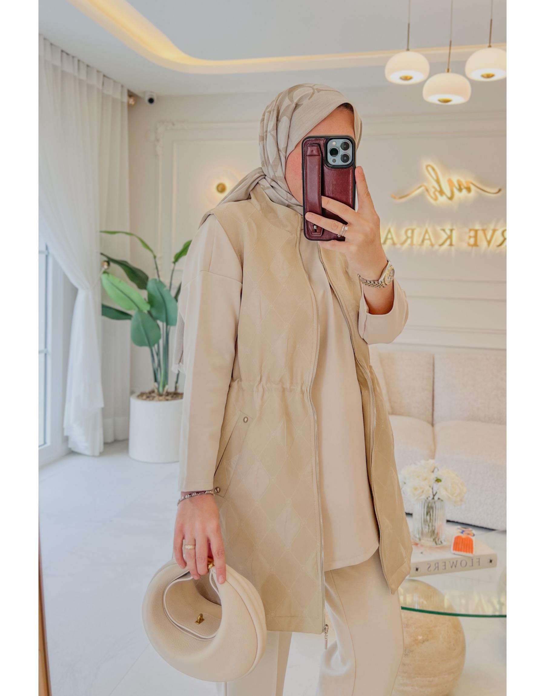 Bej 9269 Baklava Desenli Beli Büzgülü Yelek