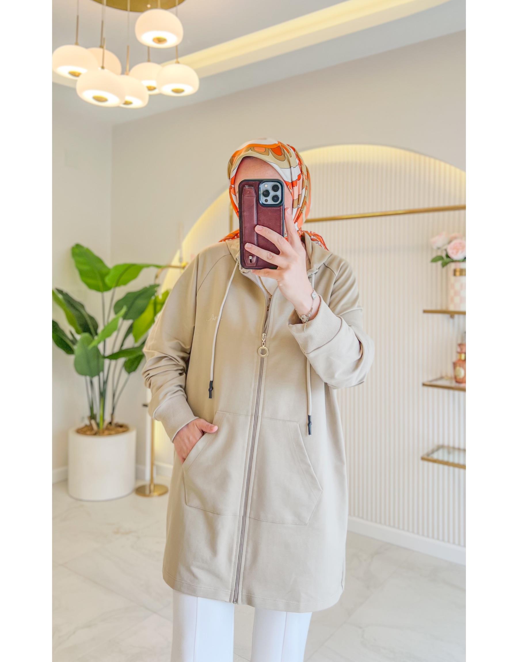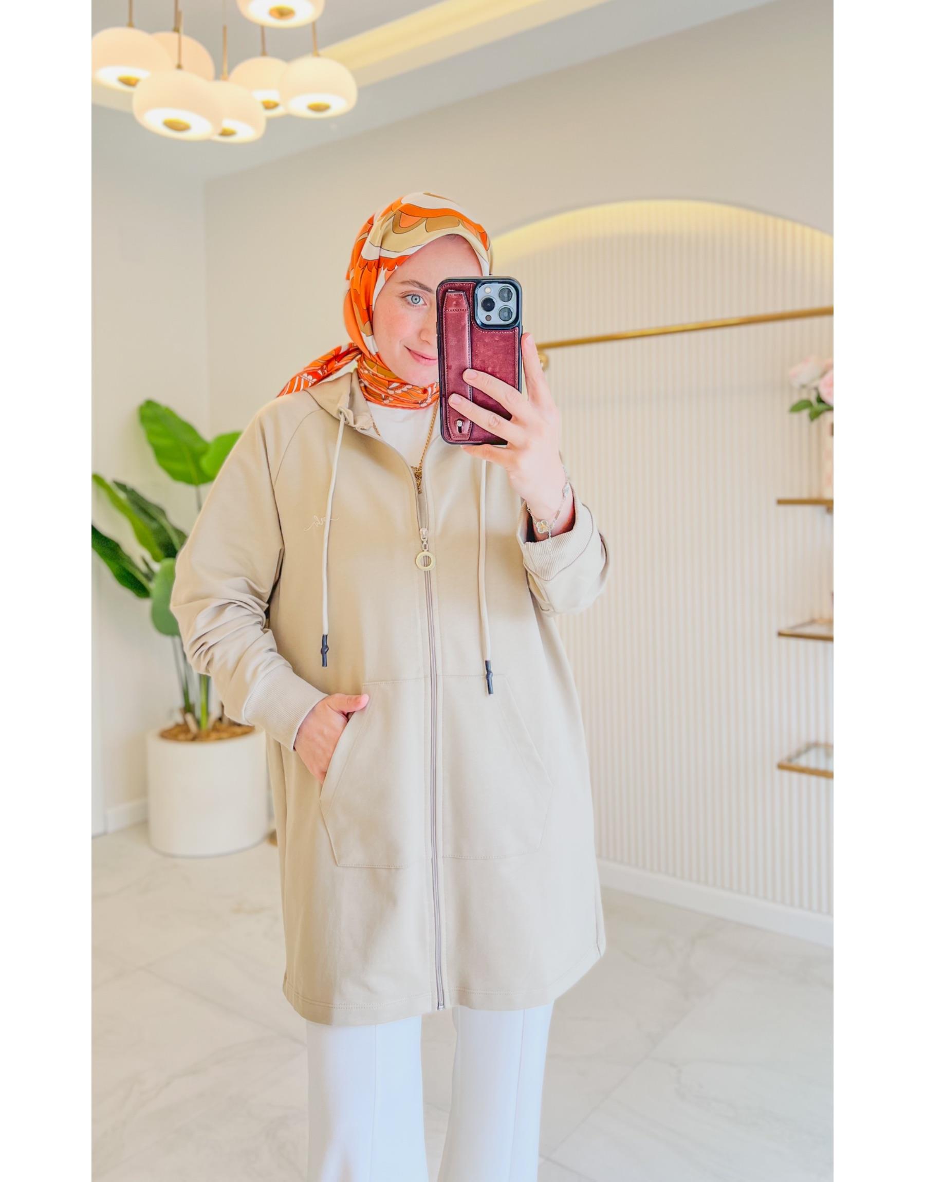 Bayan Bej MK Fermuarlı Kanguru Cepli Hırka | Merve Karaca