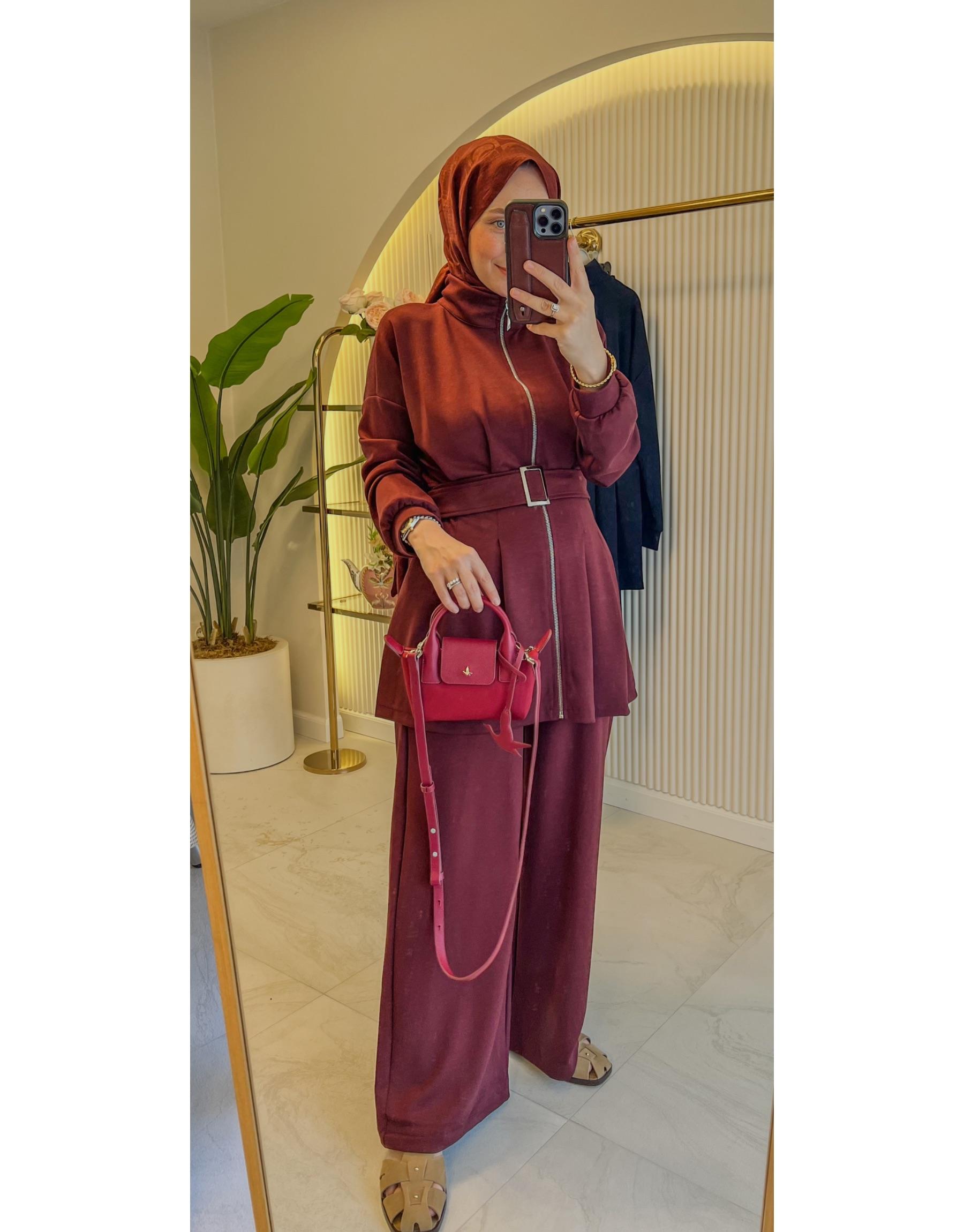 Bayan Bordo 22772 Kemerli Modal Takım | Merve Karaca