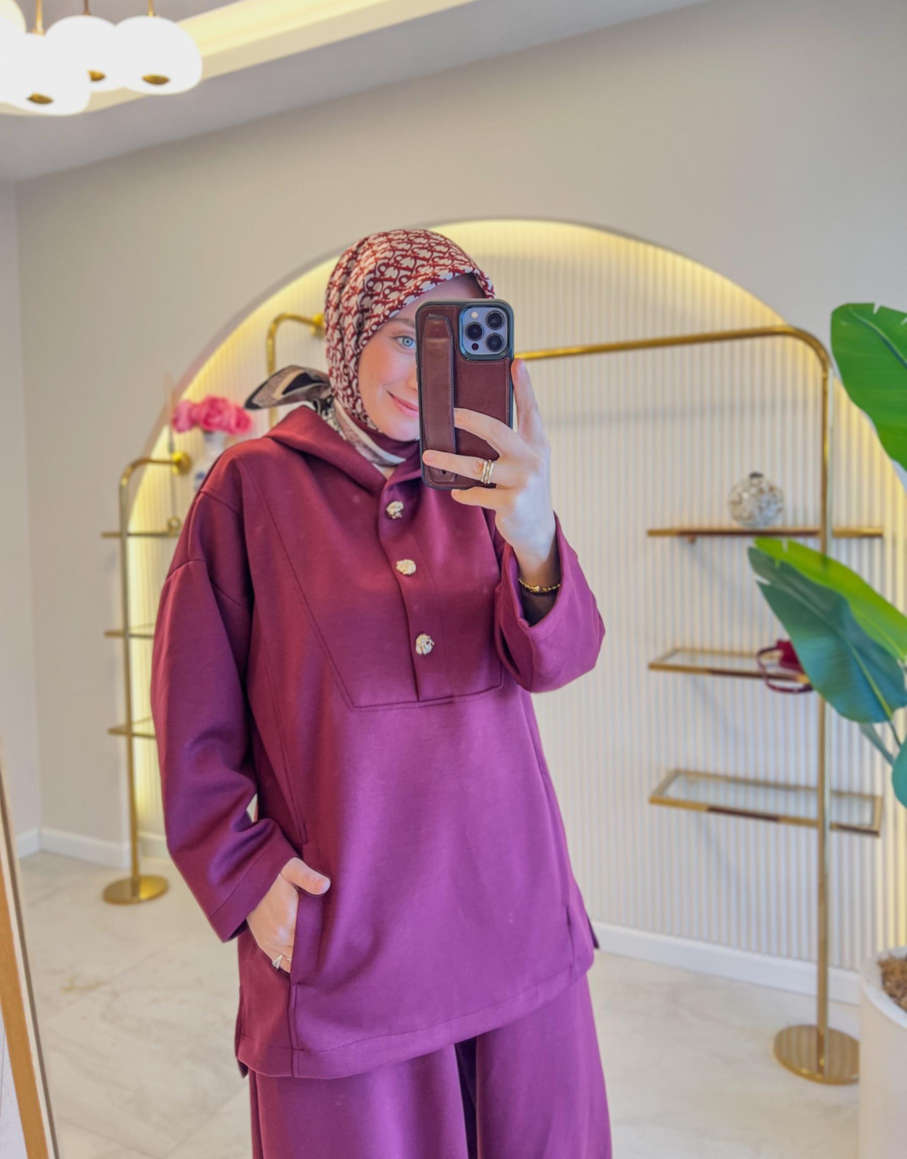 Detaylar: Gold düğme detaylı kapüşonlu tunik, geniş paçalı pantolon