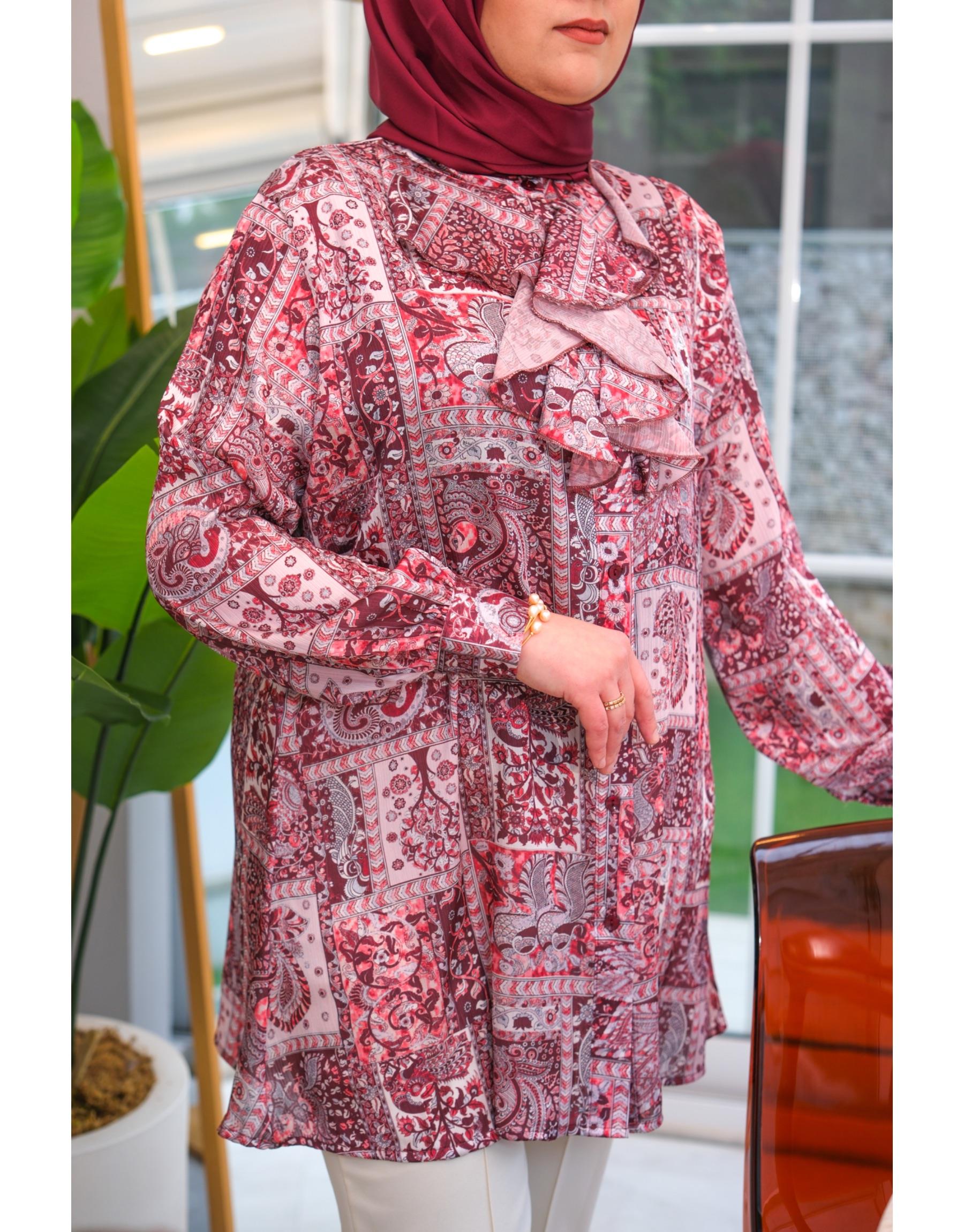 Bayan Bordo Yaka Volanlı Şal Desen Gömlek | Merve Karaca