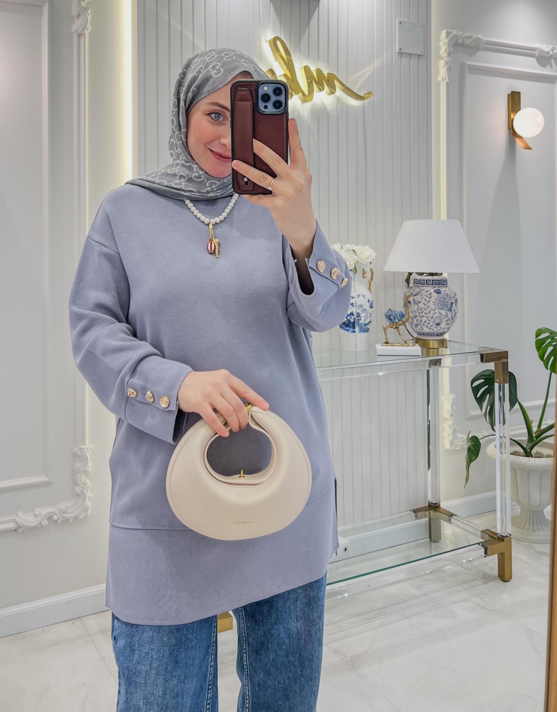 Bayan Gri 17034 Kol Düğmeli Triko | Merve Karaca