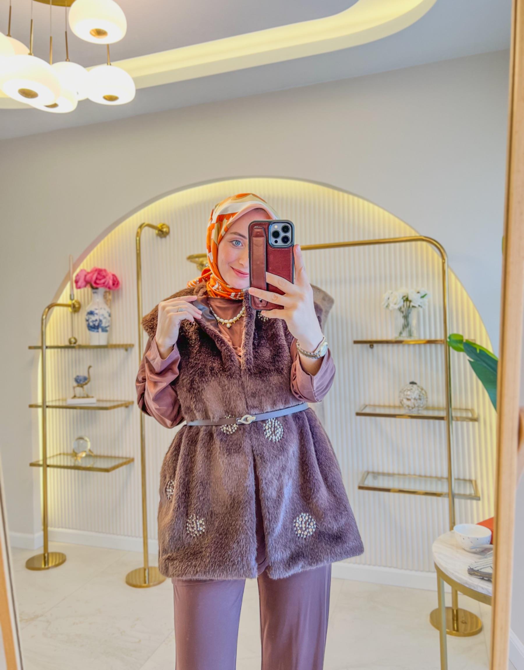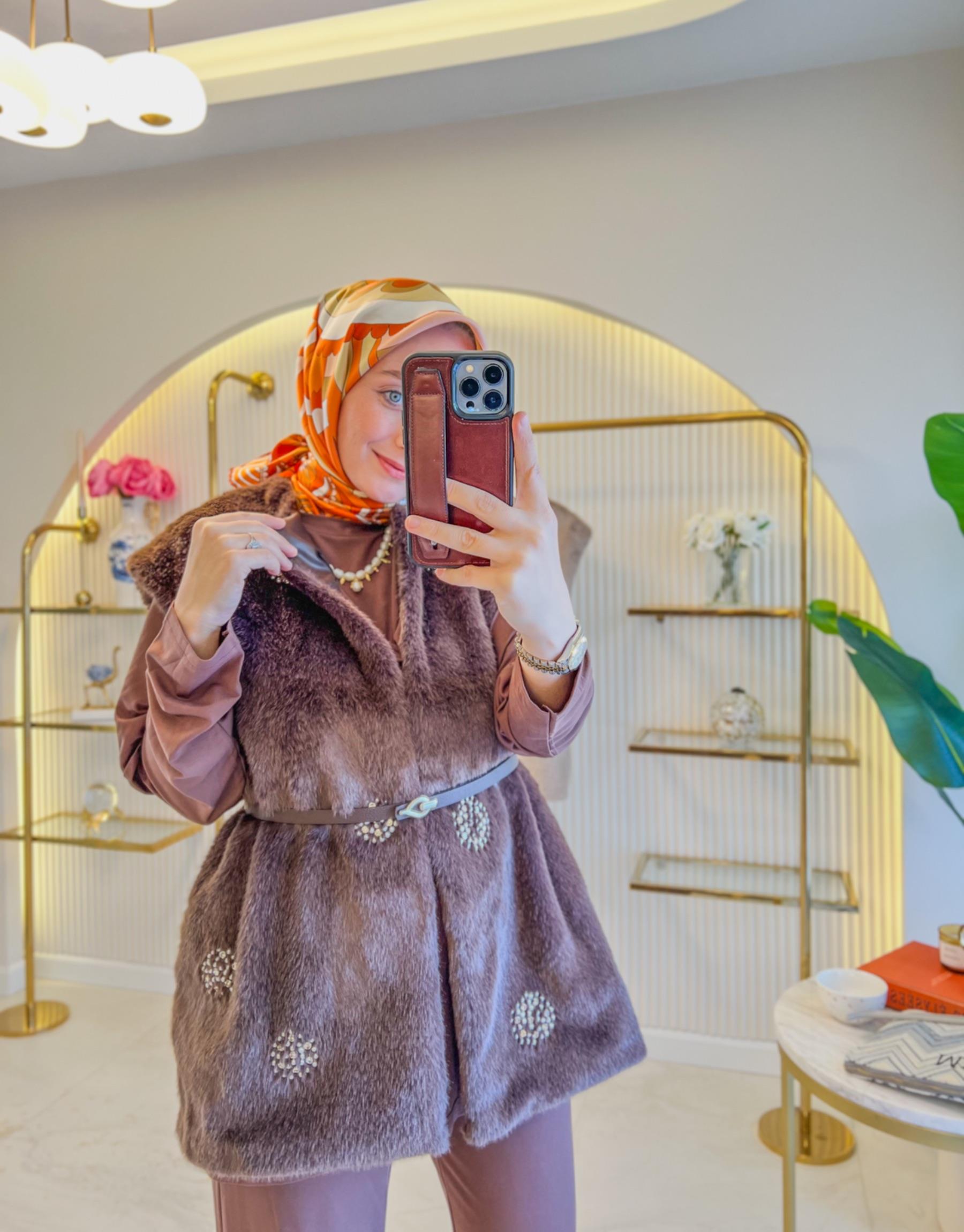Bayan Kahve 2049 İncili Taşlı Tüylü Yelek | Merve Karaca