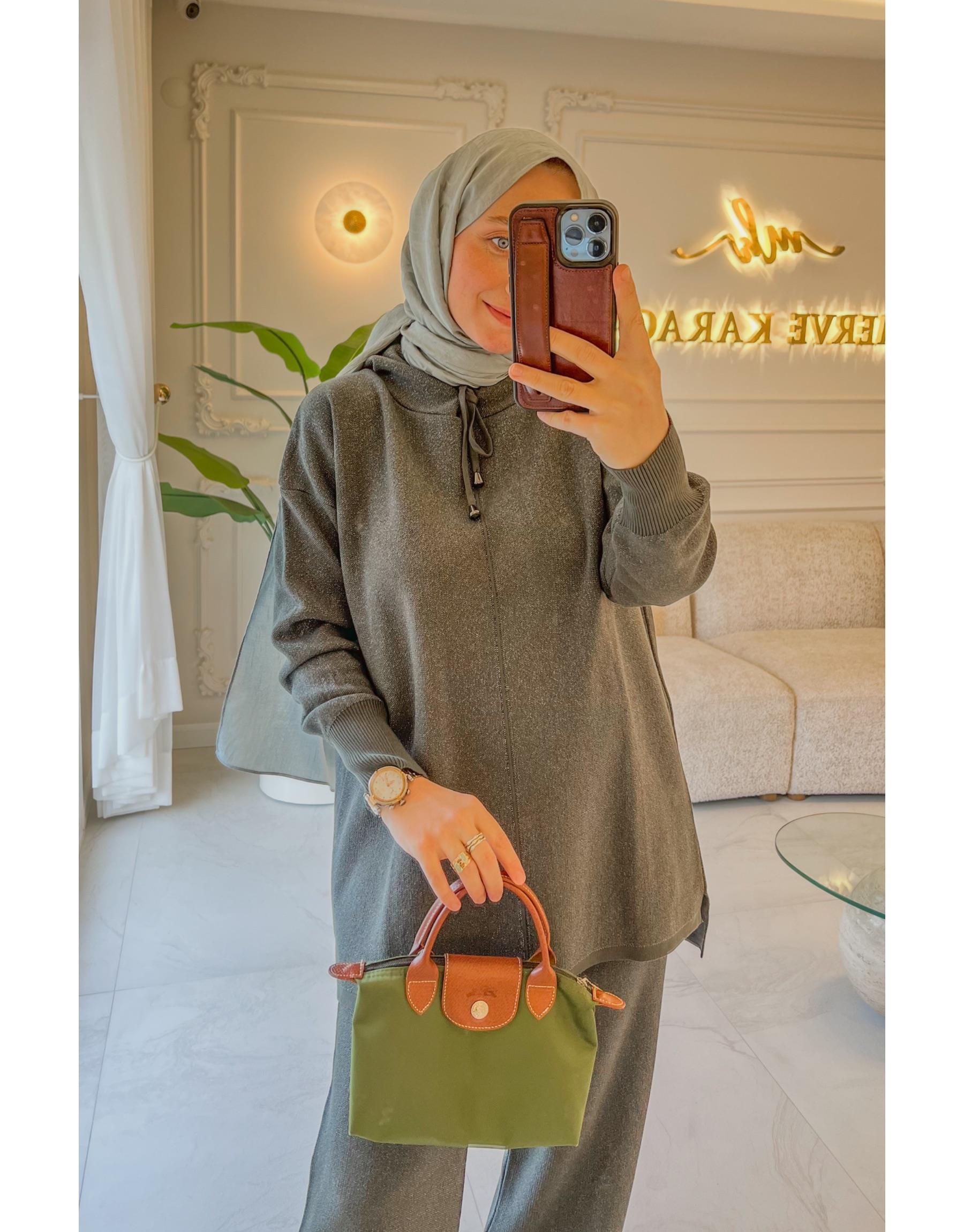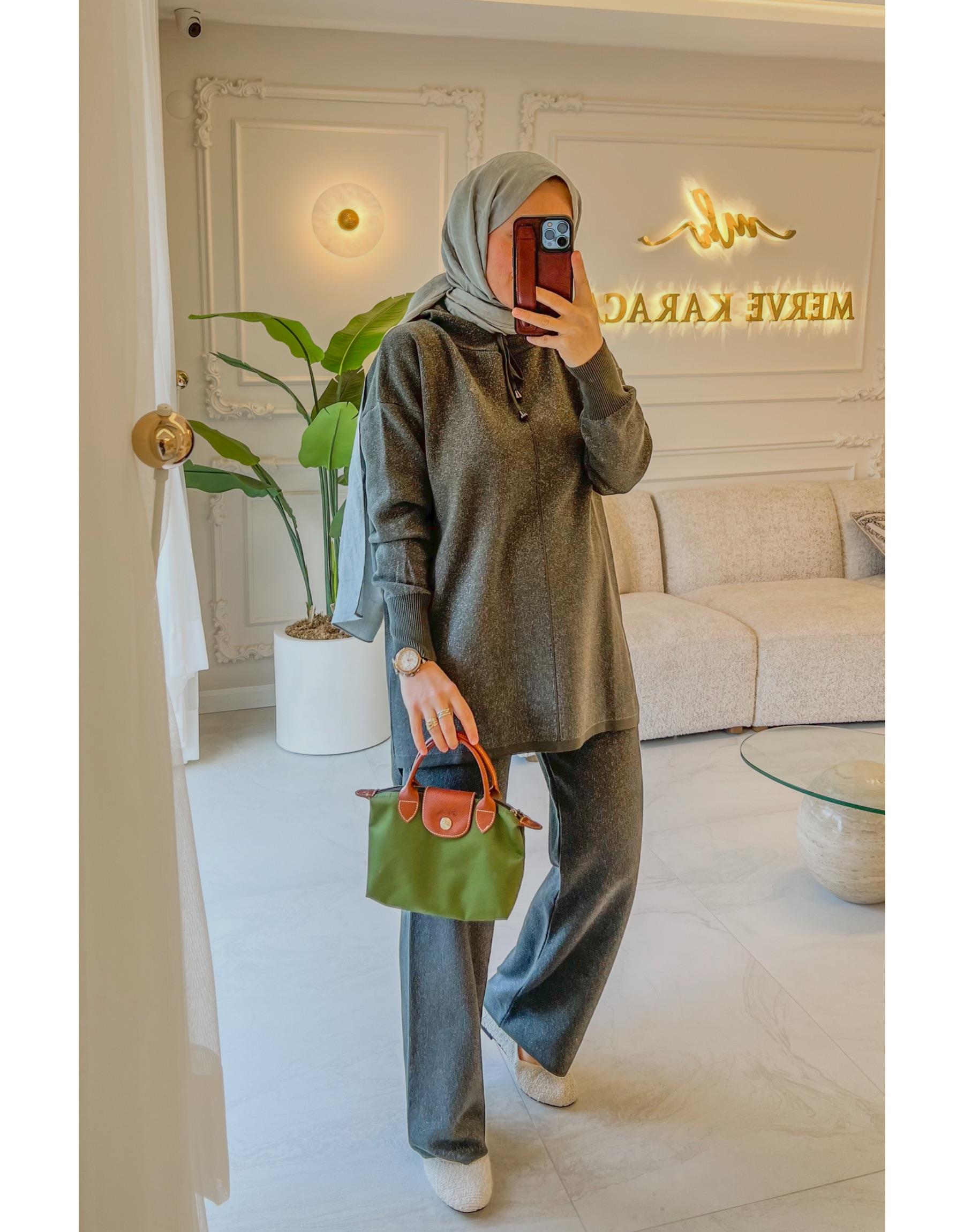 Bayan Koyu Yeşil 4158 Simli Kapüşonlu Triko Takım | Merve Karaca