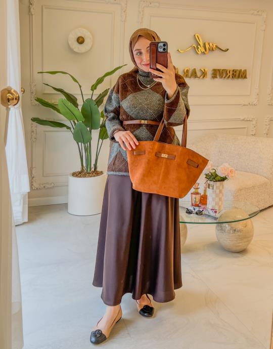 Kahve 5040 Baklava Desen Balıkçı Yaka Triko Bluz