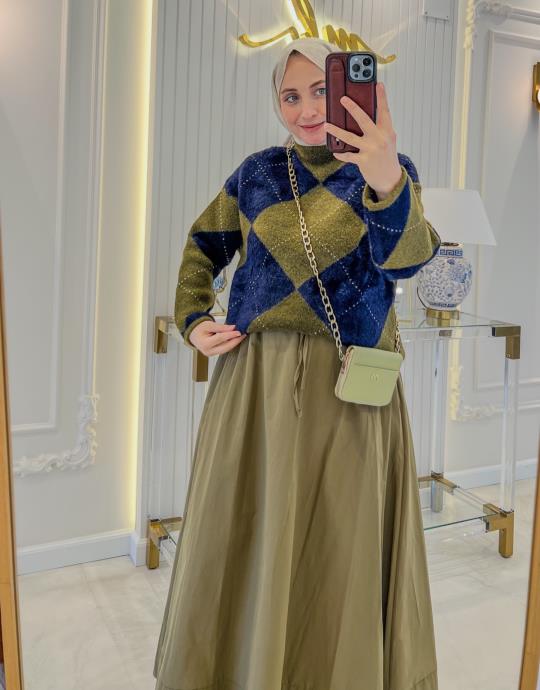 Yeşil Mavi 5040 Baklava Desen Balıkçı Yaka Triko Bluz