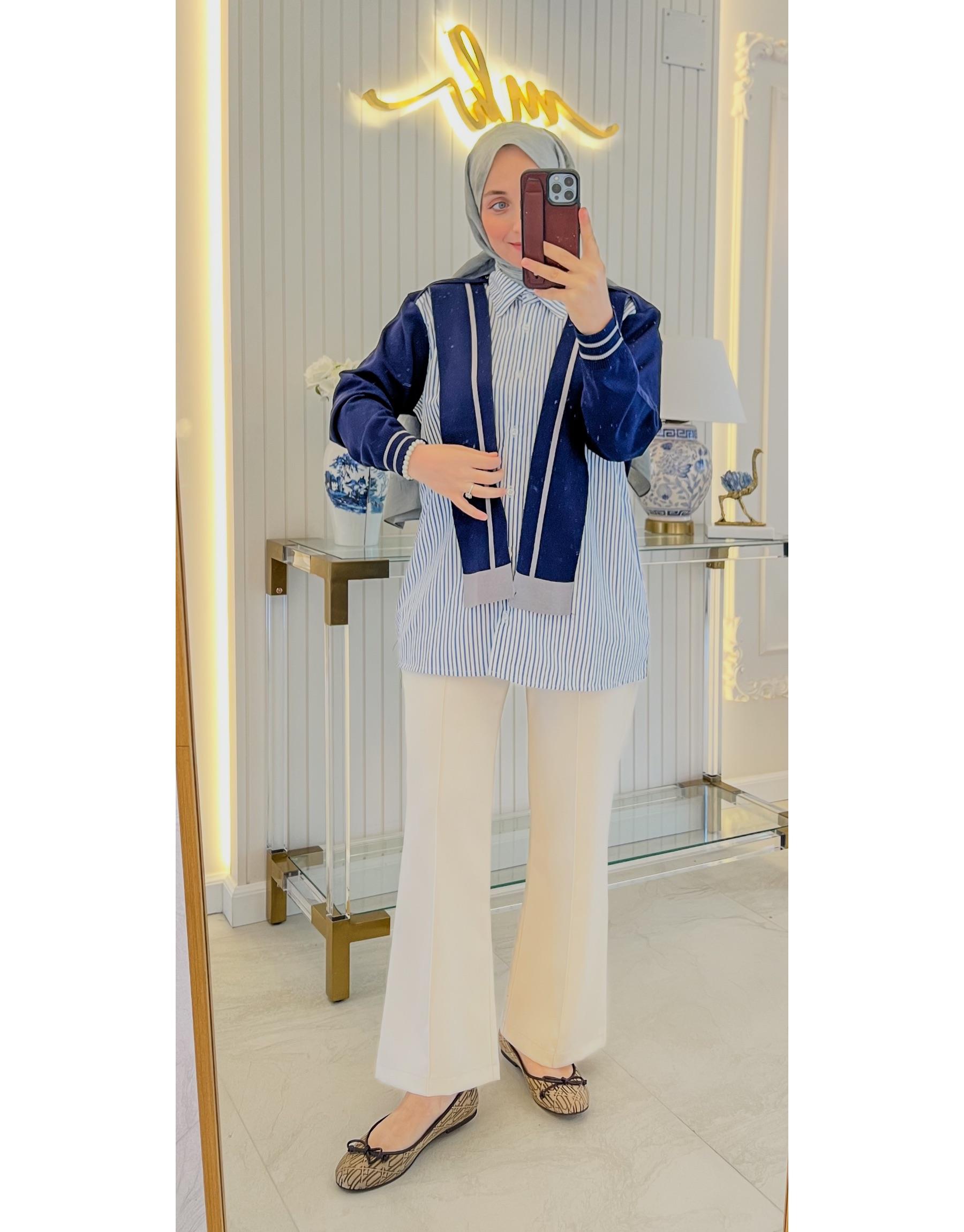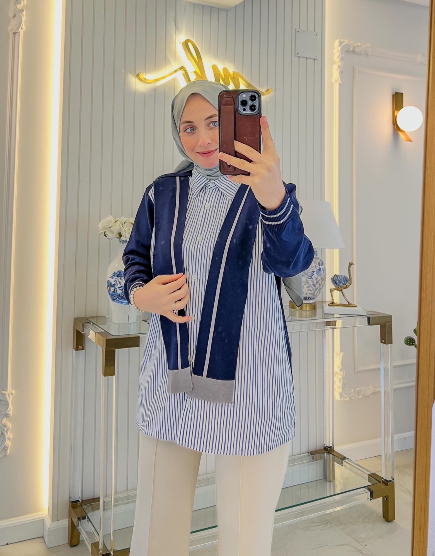 Lacivert Şal Yaka Triko Çizgili Poplin Gömlek