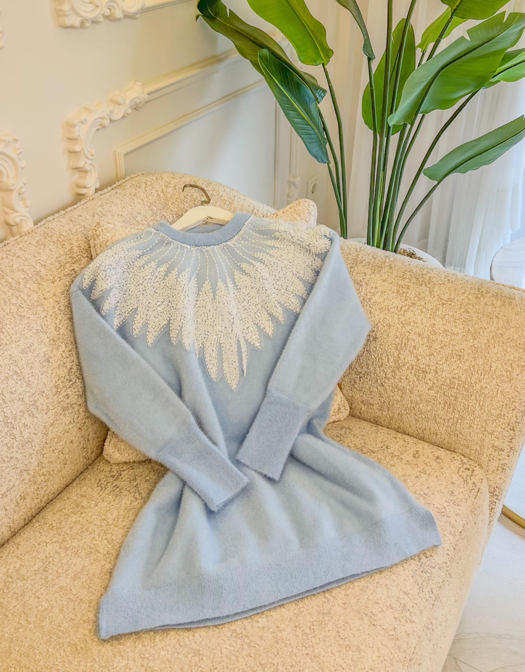 Bayan Mavi ÖN SİPARİŞ Boncuk İşlemeli Yaka Angora Tunik | Merve Karaca