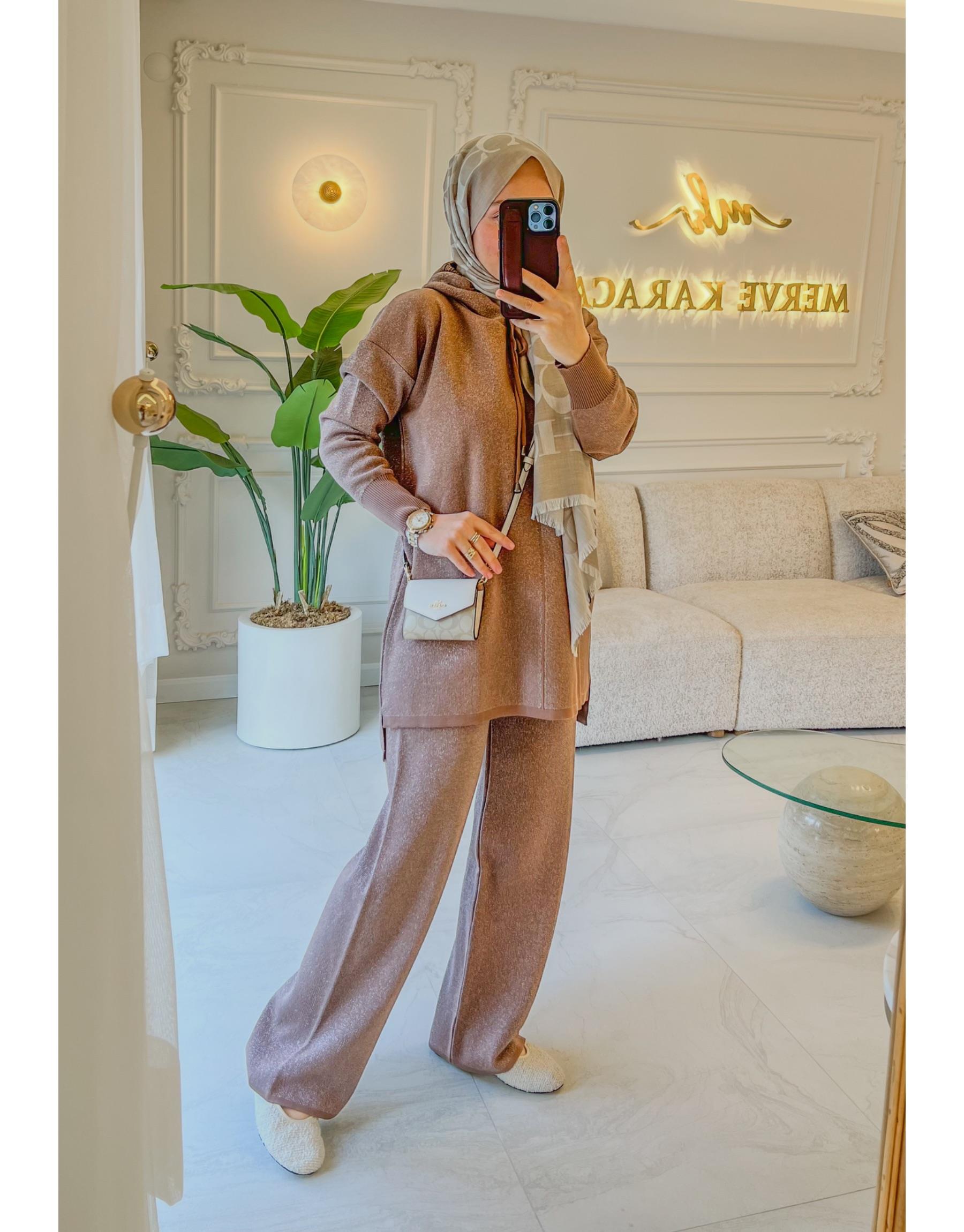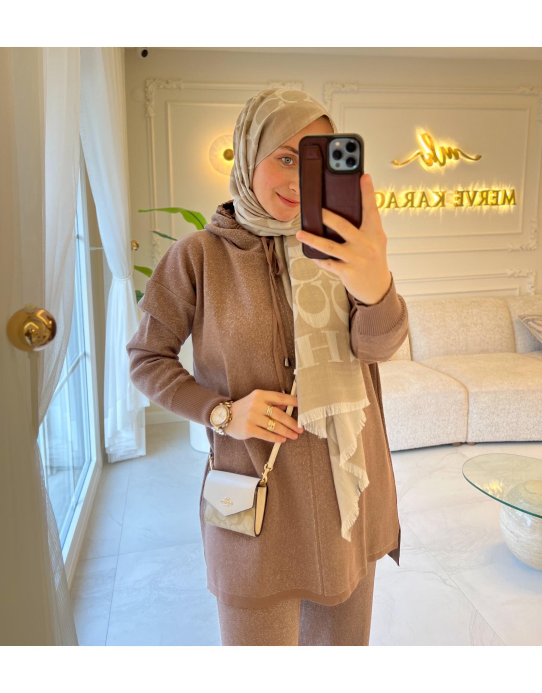 Bayan Mocha 4158 Simli Kapüşonlu Triko Takım | Merve Karaca