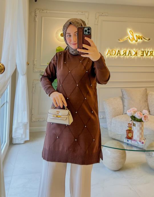 Acı Kahve Baklava Desen Taşlı Triko Tunik