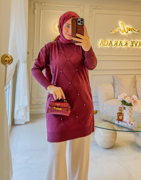 Mürdüm Baklava Desen Taşlı Triko Tunik