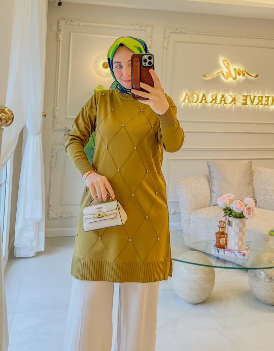 Yağ Yeşili Baklava Desen Taşlı Triko Tunik