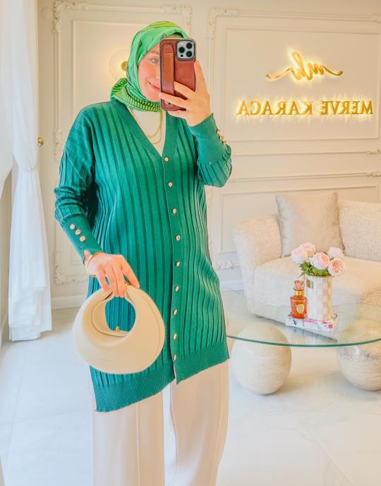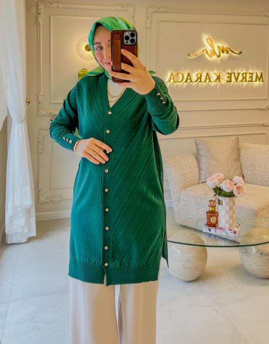 Zümrüt Şerit Desen Triko Hırka