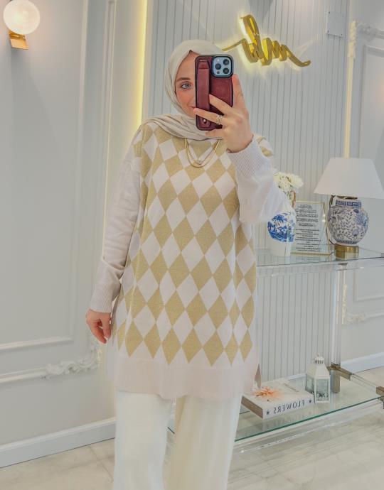 Gold 5045 Baklava Desen Simli Triko Tunik