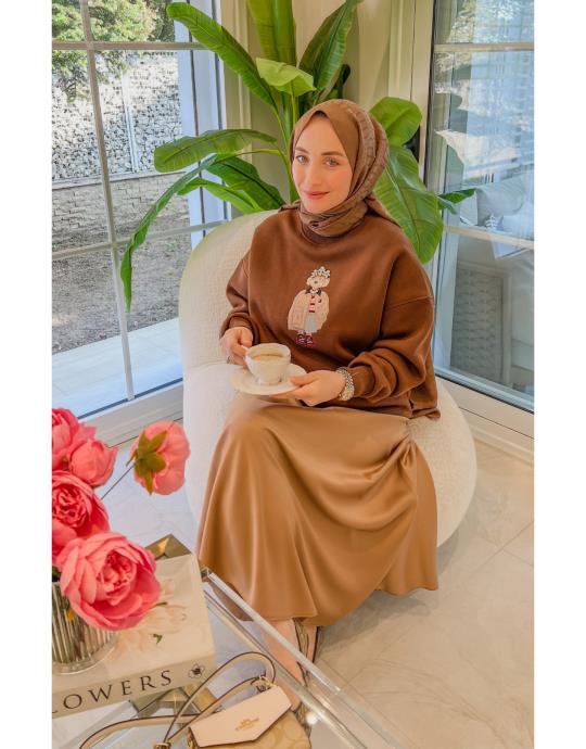 Kahve Taş İşleme Teddy Baskı Şardonlu Sweatshirt