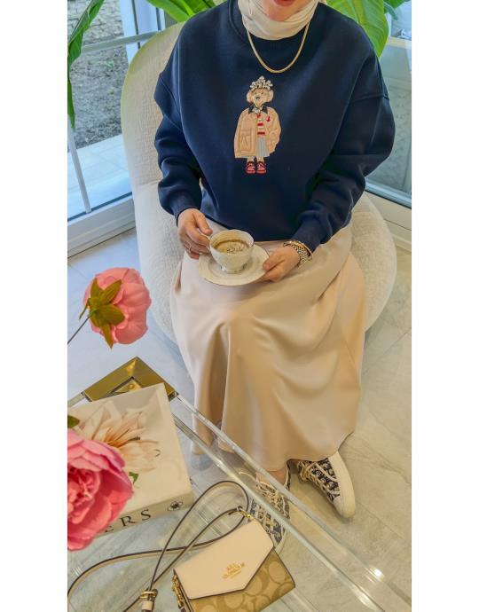 Lacivert Taş İşleme Teddy Baskı Şardonlu Sweatshirt