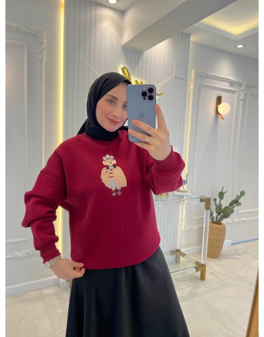 Bordo Taş İşleme Teddy Baskı Şardonlu Sweatshirt