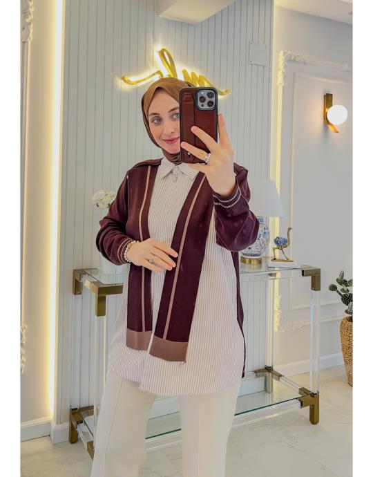Kahve Şal Yaka Triko Çizgili Poplin Gömlek