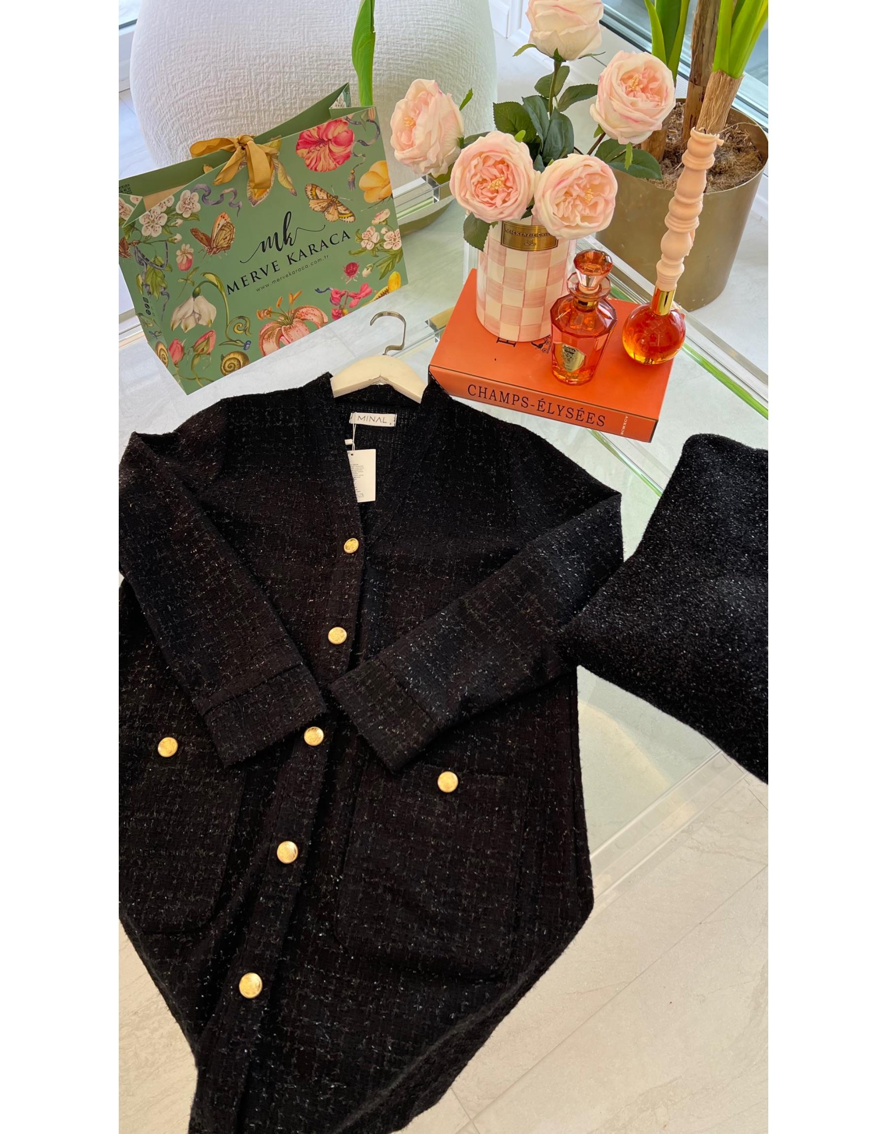 Bayan Siyah Gold Düğme Detaylı Tüvit Ceket | Merve Karaca