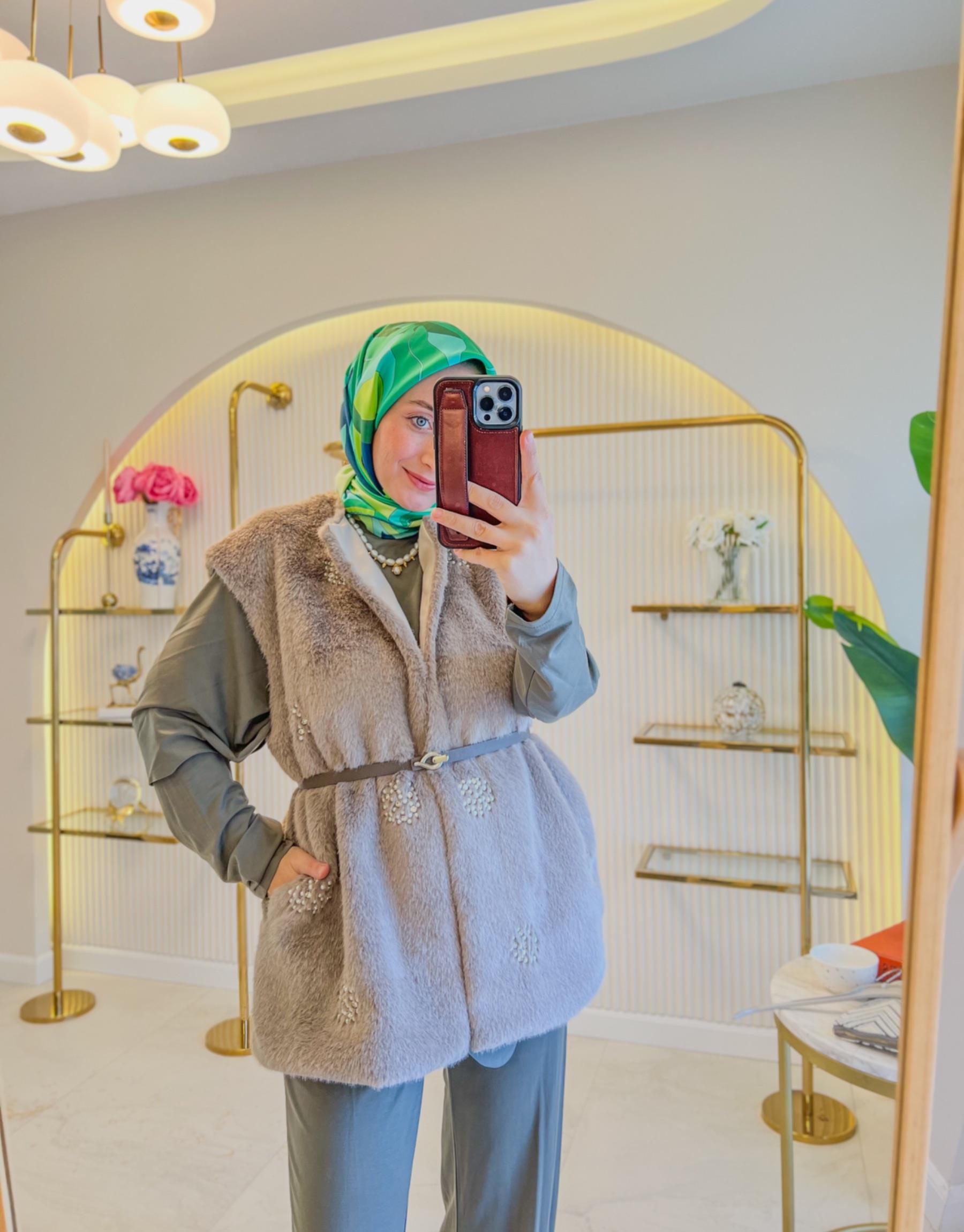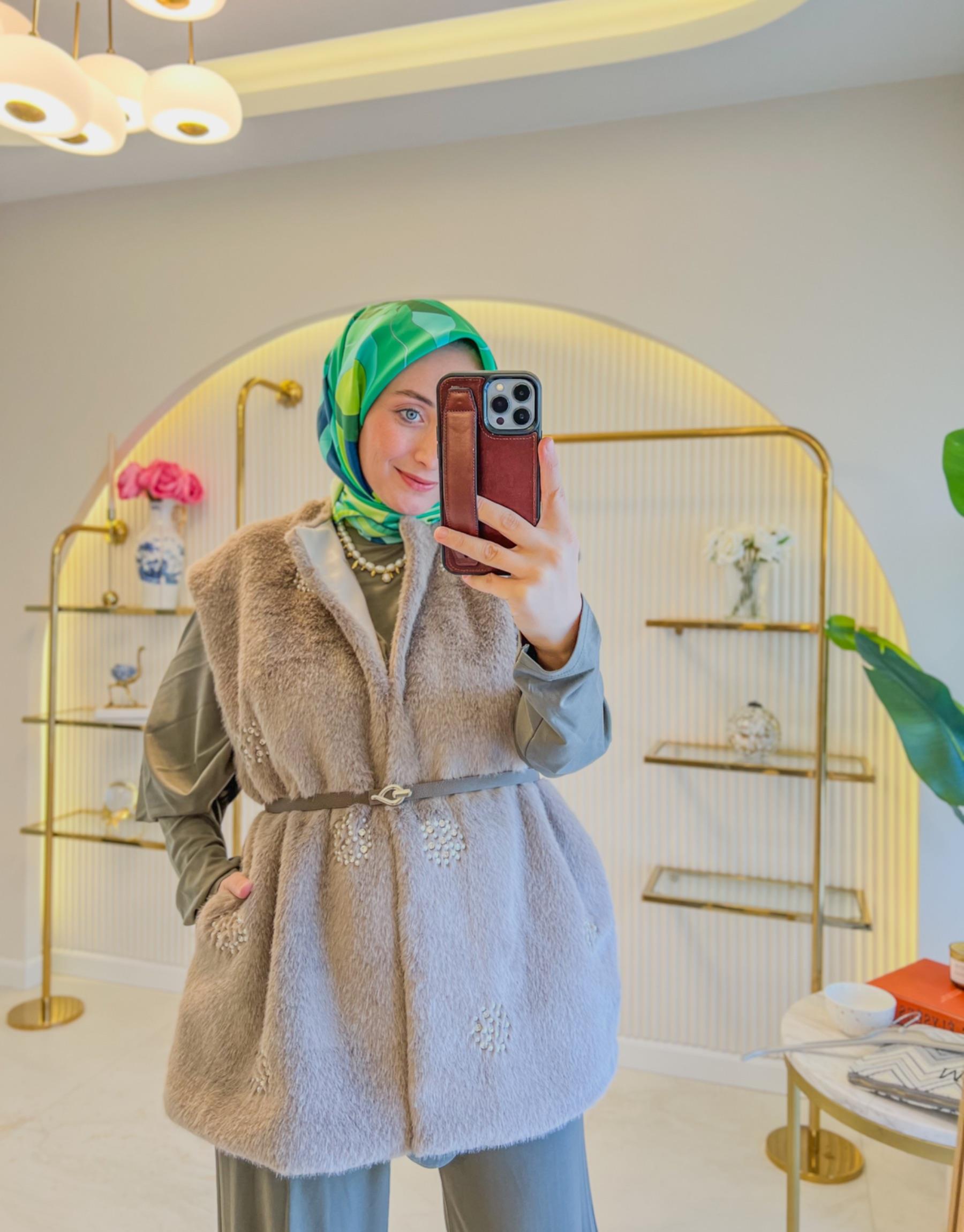 Bayan Vizon 2049 İncili Taşlı Tüylü Yelek | Merve Karaca