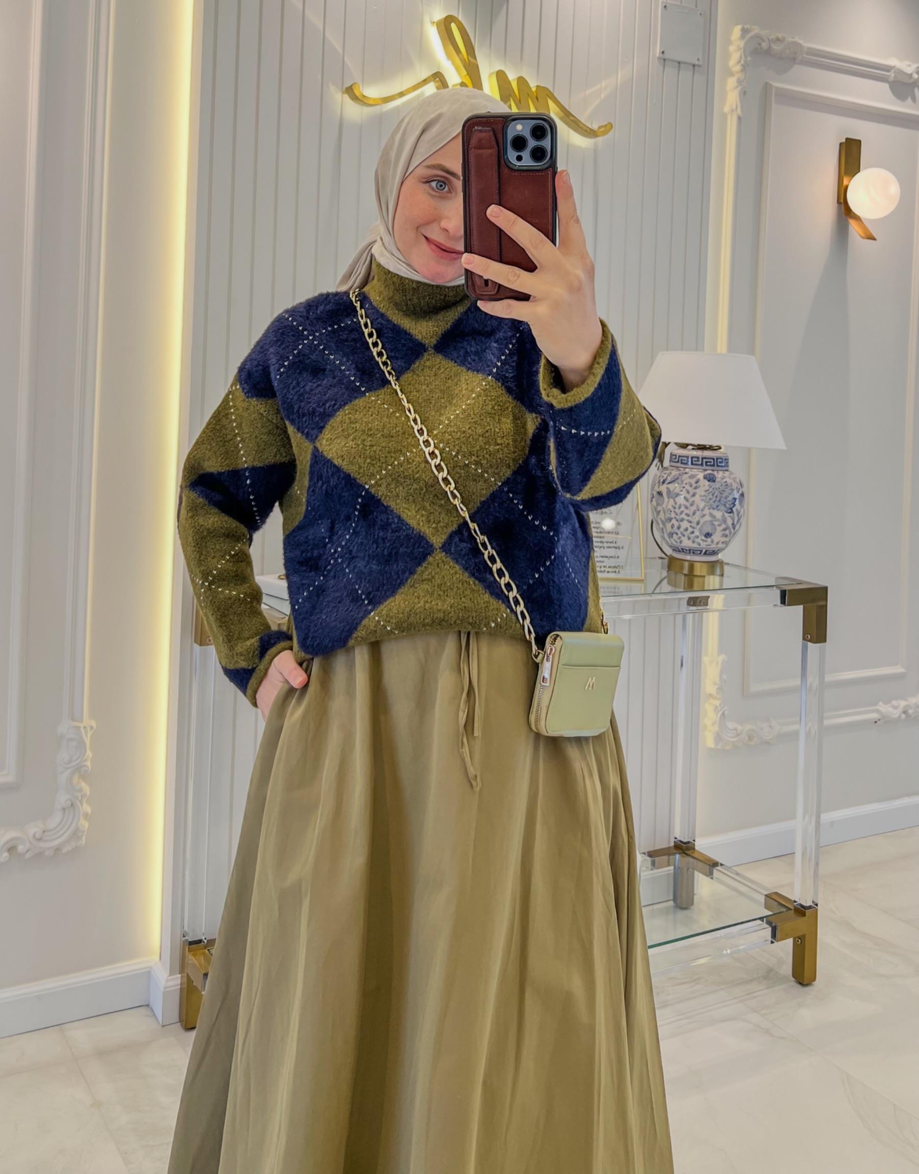 Bayan Yeşil Mavi 5040 Baklava Desen Balıkçı Yaka Triko Bluz | Merve Karaca