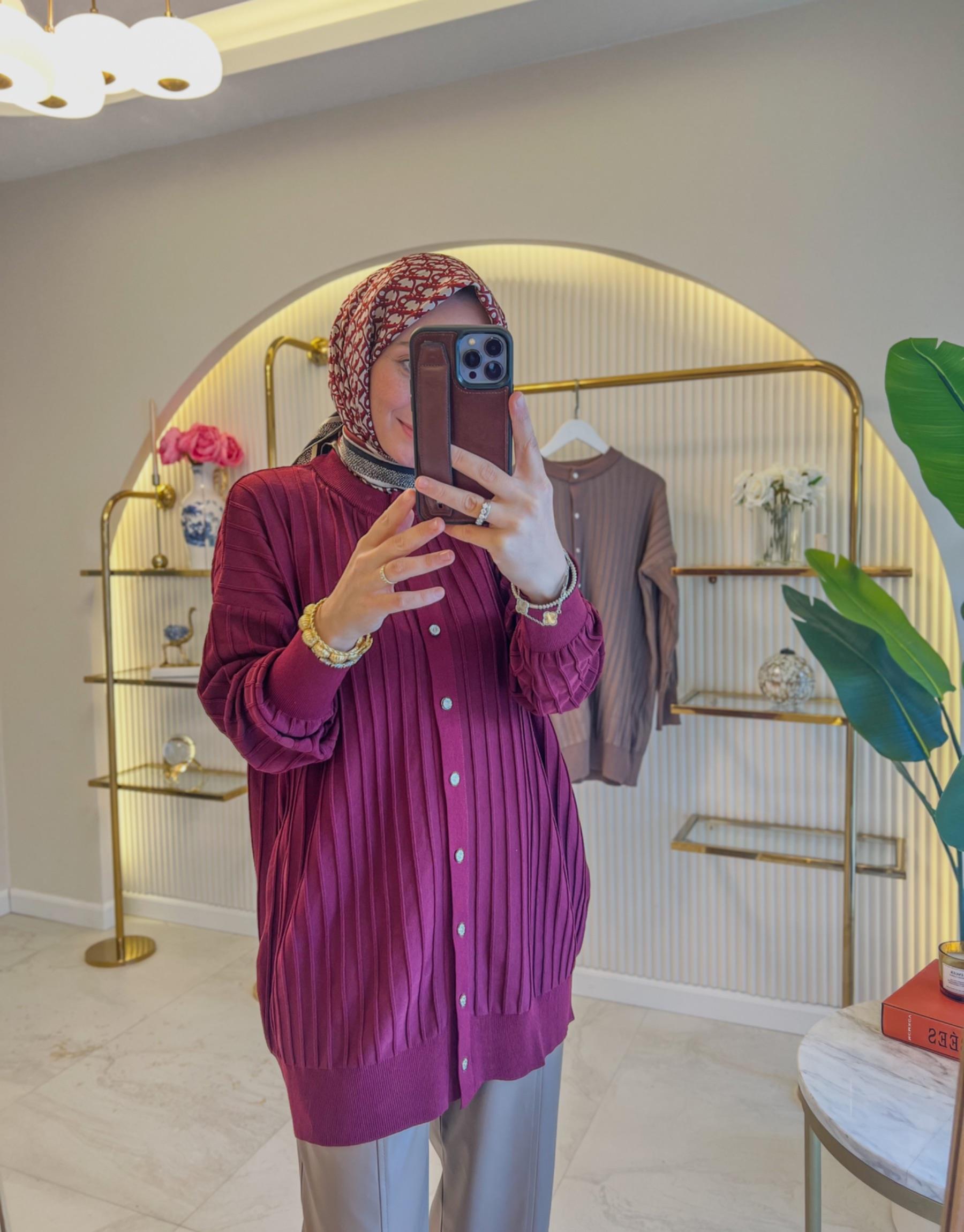 Kahve 3200 Kendinden Çizgili Taşlı Düğmeli Hırka